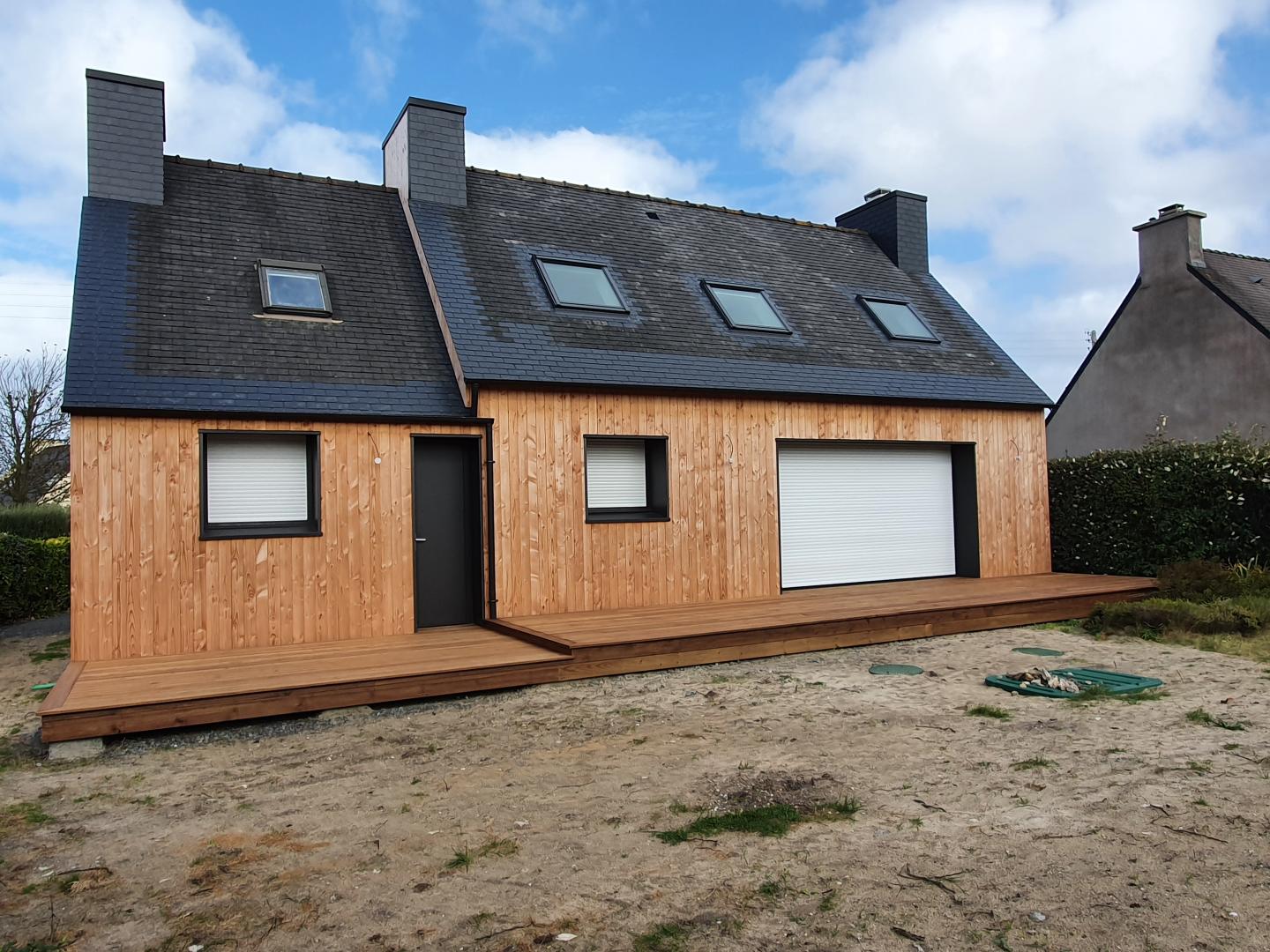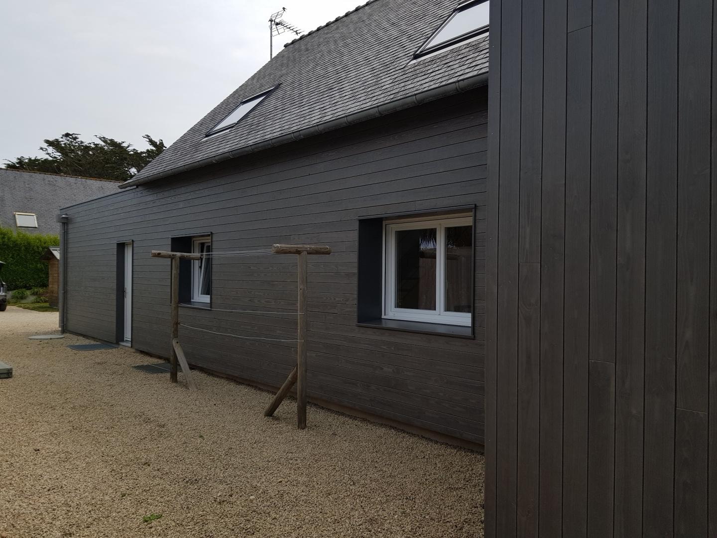 Isolation Thermique par l'Extérieur, finition des murs en bardage douglas ardoise, profil orion douglas saturé et des menuiseries en pliage aluminium couleur 2900 sablé