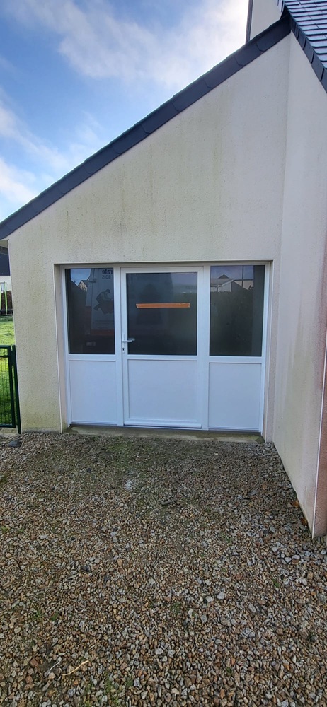 Notre cliente n'ayant plus l'utilité d'une porte de garage, nous lui avons conseillé cet ensemble pour un gain de chaleur dans la pièce, et de la luminosité avec les vitrages en partie haute
