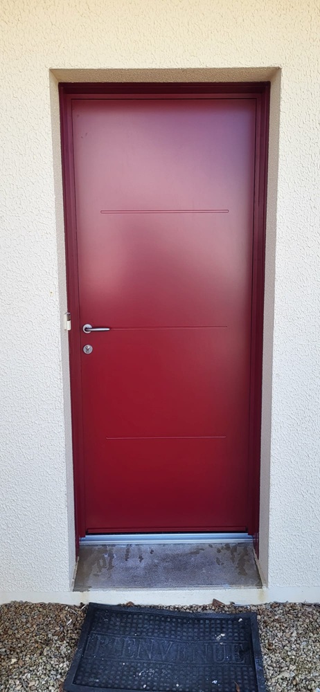 Remplacement d'une porte vitrée par une porte d'entrée Alu modèle Tyler, bi coloration : ral 3004 satiné ( rouge ) en extérieur et 9016 ( blanc ) en intérieur
